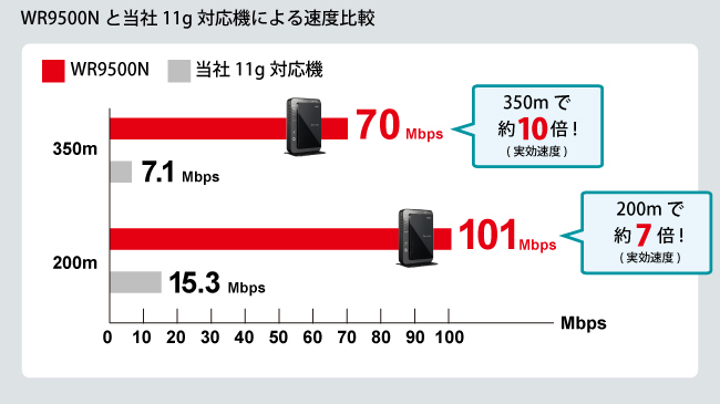 また、WR9500NのWi-Fi高速中継機能は、無線通信の速度低下が少ないので快適にご利用いただけます。