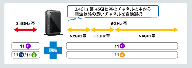 映像や音楽などのストリーミングを楽しむなら、電波干渉が少なく高速で安定した"11n/a(5GHz帯)"。2.4GHz帯対応のパソコンやゲーム機、プリンタやスマートフォンなどは"11n/g/b(2.4GHz帯)"で。と、異なる周波数帯を同時に使い分けて利用でき、しかも11nの450Mbps※という通信速度を2つの周波数帯で独立して使えるから、それぞれが高速、快適です。