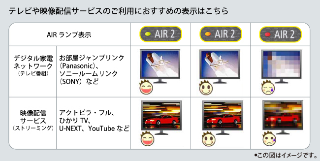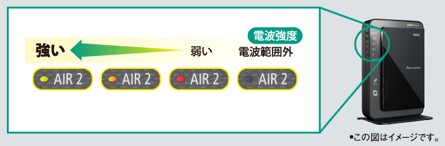 子機モードで利用時は、AIRランプの色が3段階に変化して、WR9500Nの電波強度を目で見て確認することができます。部屋の中で電波の届きやすい場所を探して設置するなど、便利にご利用いただけます。