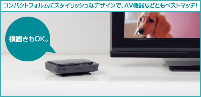 横置き・壁掛けでの利用も可能。コンパクトでスタイリッシュなデザインなので、テレビやレコーダーの側に置いてもマッチします。