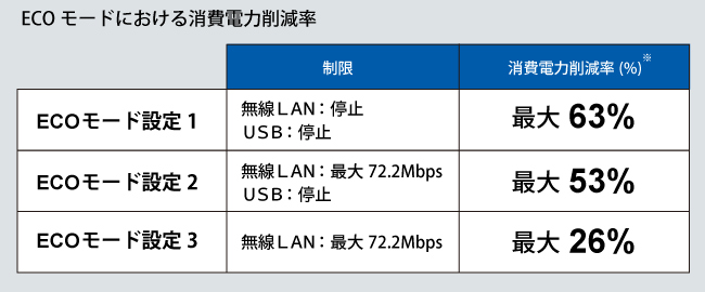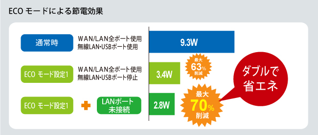 無線LAN機能とUSBポートを停止する、最も節電効果の高い設定です。WR9500N(HPモデル)では待機消費電力を最大63%カット。