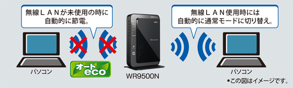 無線LAN機器を使っていないときには[ECOモード]に。使用時には、すぐに通常モードへ自動的に切り替わります。[ECOボタン]を押す手間や押し忘れをなくす便利なECO機能です。