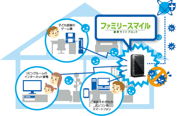 ネットスター株式会社のフィルタリングサービス「悪質サイトブロック ファミリースマイル」に対応。悪質なサイトや有害サイトへのアクセスを、ご家庭のインターネットの出入口でAtermがブロックして、家族みんなを危険なサイトから守ります。