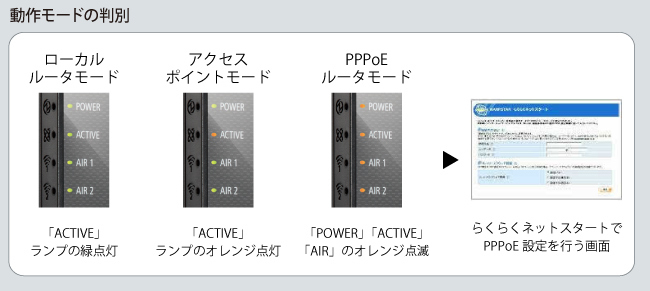 ブロードバンド回線にルータを接続するときに必要な動作モード選択が、「らくらくスタートボタン」を押すだけでOK。適切なモードを自動選択し、インターネットに接続します。接続アカウントが必要な"PPPoEルータモード"の場合も、専用画面からIDとパスワードを入力するだけです。