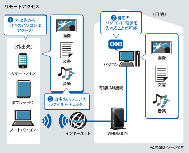 外出先からインターネット経由で、自宅のパソコン※1の電源を入れることが可能。留守中でもつねに起動させておく必要がないため、安心で経済的です。