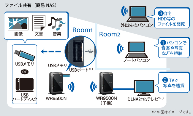 USBポートに接続したハードディスクのファイルを利用したい。そんな時でも省エネしながら無線LANが使えます。
