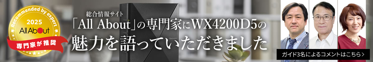 WX4200D5では、従来の5GHz帯(11ac)3ストリーム機の約2.7倍となる最大3603Mbpsの5GHz帯通信が可能に。また、2.4GHz帯通信においても574Mbpsの通信性能を備えています。