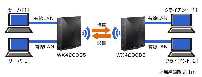 Aterm WX4200D5[ブリッジモード]のLANポートに接続したサーバパソコンからAterm WX4200D5[子機モード]を接続したクライアントパソコンへのデータ転送速度(送信)の実測値です。なお、クライアントパソコンからサーバパソコンへの通信速度(受信)は、送信速度より低い場合があります。
