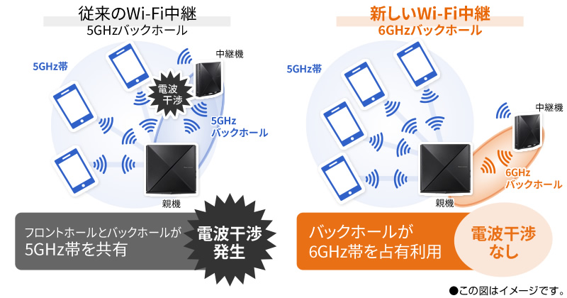 たとえば、対応端末の多い5GHz帯と2.4GHz帯は端末との通信に利用しながら、メッシュ中継に使うバックホール※として6GHz帯を利用することで、中継機能利用時にも高速かつ安定したWi-Fi通信を可能にします。