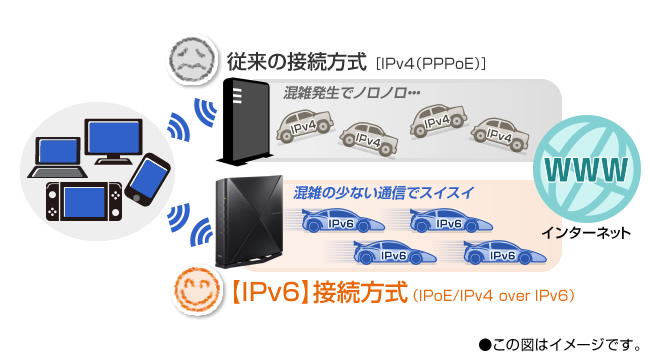 ネット接続端末の急増に対処するために登場した接続方式「IPv6(IPoE)※」に対応。従来のIPv4方式に比べて混雑が少なく、安定した通信が可能になります。