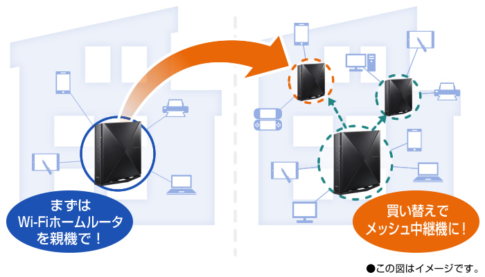 WX5400T6は、メッシュWi-Fi親機としての使用はもちろん、メッシュ中継機としての使用も可能です。