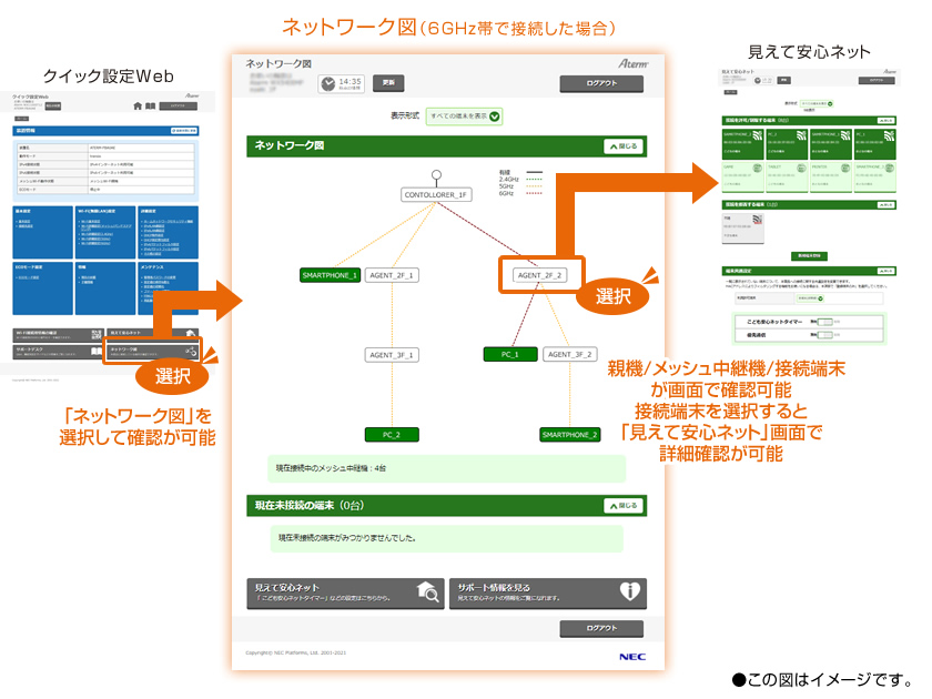 Atermの設定画面【クイック設定Web】を使ってメッシュ中継機の表示が可能。ネットワーク図の画面で、接続している親機/メッシュ中継機/接続端末が確認できます。