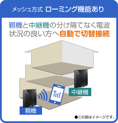 【メッシュ中継機能】によるWi-Fiエリア拡大により、電波が届きにくかった場所でも安定した高速通信が行えます。