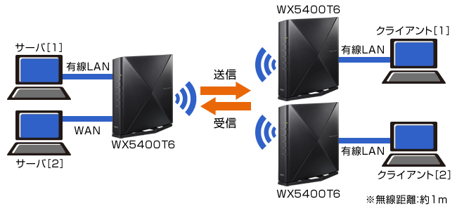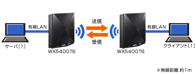 Aterm WX5400T6[ブリッジモード]のLANポートに接続したサーバパソコンからAterm WX5400T6[子機モード]を接続したクライアントパソコンへのデータ転送速度(送信)の実測値です。なお、クライアントパソコンからサーバパソコンへの通信速度(受信)は、送信速度より低い場合があります。