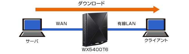 Aterm WX5400T6のWANポートに接続したサーバからLANポートに接続したクライアントパソコンでファイルをダウンロードした場合のデータ転送速度の実測値です。