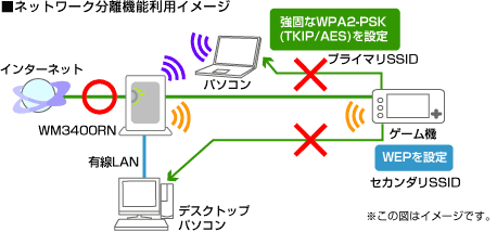 WM3400RNなら、セカンダリSSIDに接続した機器は、インターネットへのアクセスだけできるようにし、プライマリSSIDや有線LANに接続の機器へのアクセスを制限できます。例えばWEP暗号化を設定したゲーム機から、強固なAES暗号化を設定したパソコンにアクセスできないので安心です。さらにセカンダリSSIDには「AES」も設定できるので、一家で仕事用と家庭用のパソコンなど無線機器を分離させたネットワークも利用できます。