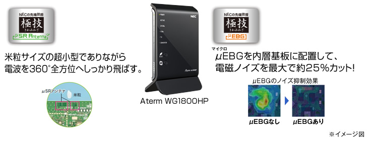 11ac対応Atermの最新フラッグシップモデル(最上位機種)である「WG2600HP2」。業界最速※の実効スループットを実現したこの機種は、NEC独自の先進技術とアイデアが詰まった新アンテナシステムを搭載しています。