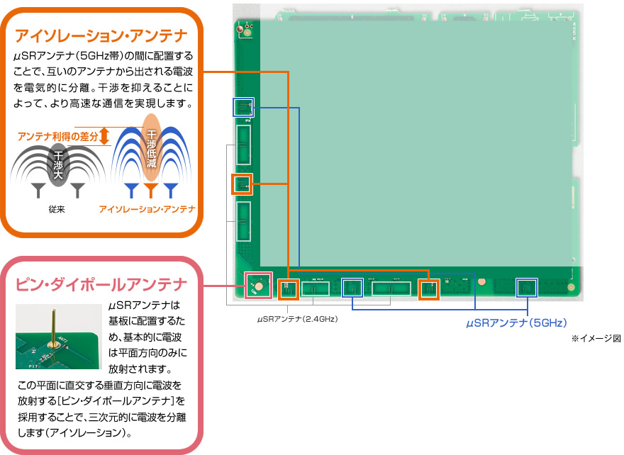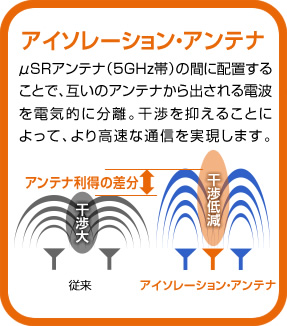 アンテナ間の分離(アイソレーション)を確保することで電波干渉を低減できれば、より高速な通信ができるのではないか。その発想を具現化したのが[アイソレーション・アンテナ]と[ピン・ダイポールアンテナ]という2つのサブアンテナの搭載です。