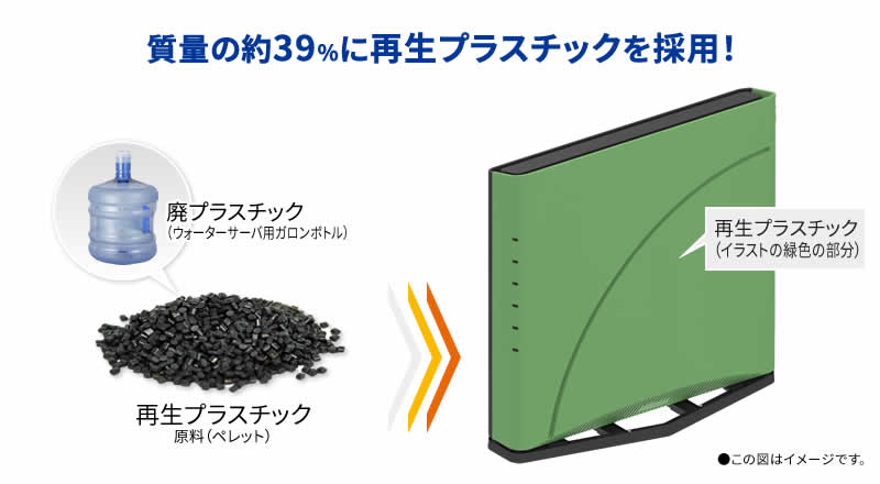 7200D8BEは、本体部品の一部に再生プラスチックを採用しました。通常、再生プラスチックは廃材と未使用材を混ぜていますが、環境負荷低減効果の最大化を目指し、使用済みウォーターサーバー用ボトルの廃材を100%原料とした再生プラスチックを製品に採用しました。 環境調和性の高い製品の提供を目指しています。