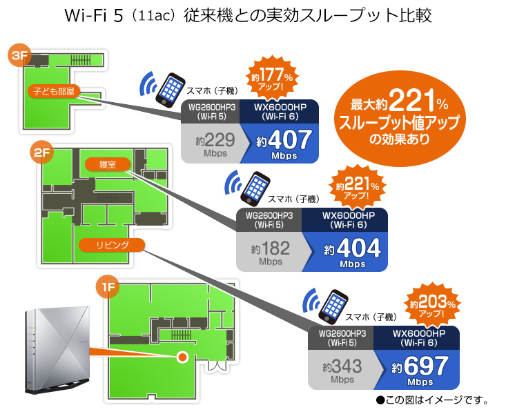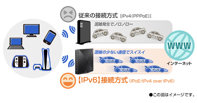 IPv4の機器においてもIPv6通信を可能にする技術が「IPv4 over IPv6※」です。Wi-Fi速度は機器の性能以上は出ませんが、その先のネット回線速度の恩恵は受けられるので、従来より安定し、繋がりやすくなることが期待できます。
