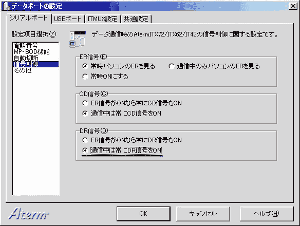 対策方法ディップスイッチの「6」番をOFFにして、「Atermモード」に変更すれば、本現象は発生しません。 「CDCモード」のままでご利用になる場合は、次のようにして「DR信号を通信時のみONとする」に設定することで解決が可能です。