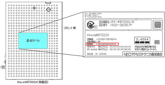 であり、不具合に該当する製品は製造番号により判別可能です。 [製造番号の該当条件] 製造番号が「125」または「126」から始まり、かつ末尾が「A」の製品 ただし末尾の「A」のあとに「・」がついているものは、本不具合を対策済みであり対象外となります。 ※製造番号はWB7000Hの側面の品名ラベル(下図参照)をご確認ください。