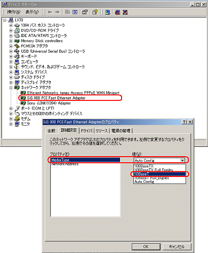 ネットワークアダプタのプロパティ画面が表示されますので、[詳細設定]タグをクリックし、プロパティの[MediaType]を選択し、値のプルダウンボタンをクリックして選択メニューの[10BaseT]を選択・指定する。 |
