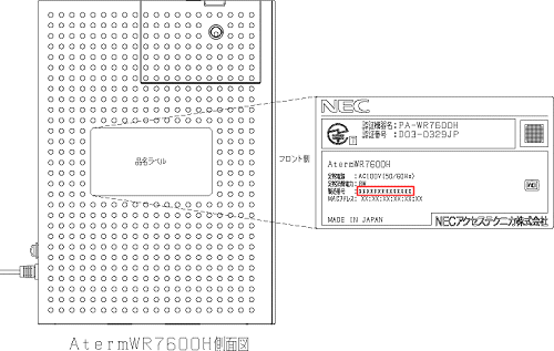 ※製造番号はWR7600Hの側面の品名ラベル(下図参照)をご確認ください。