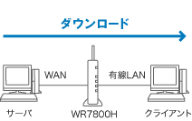 | AtermWR7800HのWANポートに接続したサーバからLANポートに接続したクライアントパソコンでファイルをダウンロードした場合のデータ転送速度の実測値です。 |