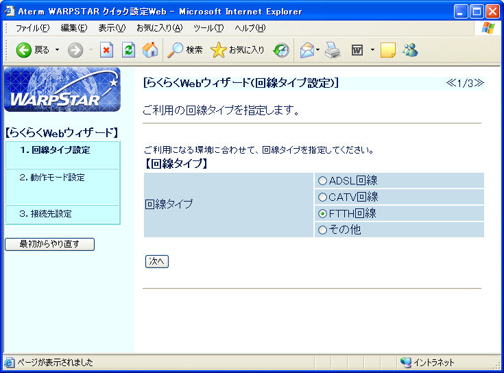 [回線タイプ]の選択画面が表示されますので、「FTTH回線」を選択してください。 |