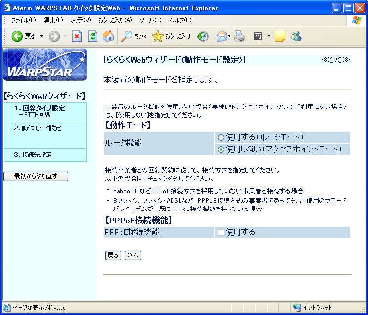 [動作モード]選択画面が表示されますので、ルータ機能を「使用しない(アクセスポイントモード)」を選択してください。 |