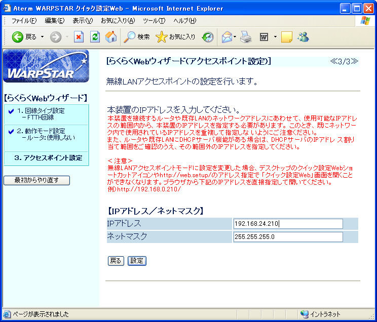 AtermのアクセスポイントモードではDHCPによるIPアドレス割り当ては受けませんので、Aterm自身のIPアドレスを、「192.168.24.101」以降に設定する必要があります。ここでは、一例として「192.168.24.210」に設定しています。