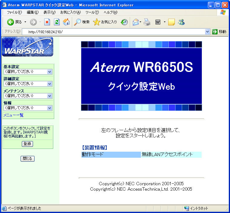 WWWブラウザを開いて、アドレス欄に「http://192.168.24.210/」を入力することで、クイック設定Webにアクセスすることができますので、左記のように正常に開けることを確認のうえ、「お気に入り」などに登録しておくことを推奨します。