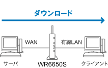 AtermWR6650SのWANポートに接続したサーバからLANポートに接続したクライアントパソコンでファイルをダウンロードした場合のデータ転送速度の実測値です。