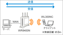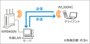 AtermWR8400N(ローカルルータモード)のWAN/LANポートに接続したサーバとAtermWL300NCを実装したクライアントパソコンでのデータ転送速度の実測値です。