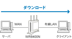 AtermWR8400NのWANポートに接続したサーバからLANポートに接続したクライアントパソコンでファイルをダウンロードした場合のデータ転送速度の実測値です。