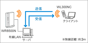 AtermWR8500N(ローカルルータモード)のLANポートに接続したサーバとAtermWL300NCを実装したクライアントパソコンでのデータ転送速度の実測値です。