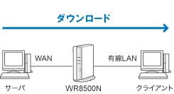 AtermWR8500NのWANポートに接続したサーバからLANポートに接続したクライアントパソコンでファイルをダウンロードした場合のデータ転送速度の実測値です。