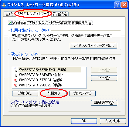 現象AtermWL54GUと親機との無線LAN接続において、接続対象となる親機を変更せずに接続暗号化モードをTKIPからWEPに変更した場合、親機との通信が可能であるにもかかわらず、PC画面右下の無線LAN接続状態アイコンが未接続のままになります。 対処方法WL54GUの接続プロファイルを以下の手順にて一旦削除し、再設定を行なうことでアイコンの表示が正常となります。 ■削除手順