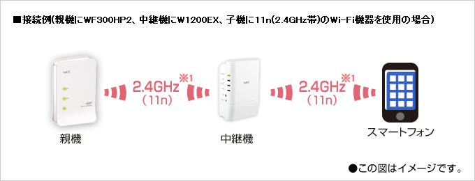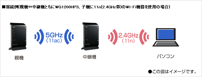 「Wi-Fi中継機能」では、親機-中継機と中継機-子機(Wi-Fi機器)の通信を同じ2.4GHz帯で中継します。