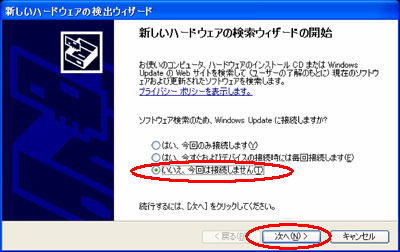 以下のような「新しいハードウェアの検索ウィザードの開始」画面が表示され、ユーティリティの進行が止まります。ここで、「いいえ、今回は接続しません(T)」を選択して、「次へ」をクリックしてください。自動的にインストール処理が再開され、その後は通常動作でインストールが行えます。詳細は下記の取扱説明書(XPご利用ガイド)をご覧ください。