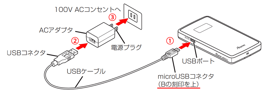 ② USBケーブルのもう一方のUSBコネクタを、ACアダプタ(当社指定:AL1-004378)のUSBポートに差し込んでください。