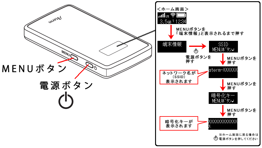 そのあと、数回MENUボタンを押すとネットワーク名(SSID)と暗号化キーが表示されます。