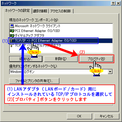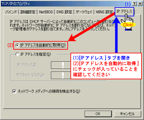 インターネットプロトコル(TCP/IP)が入っていない場合には、パソコンの説明書等をご参照の上、インストールしてください。