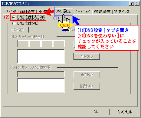 [ダイヤルアップと仮想プライベートネットワークの設定]にインターネット接続設定が入っていない場合、「ダイヤルしない」にチェックが入り、他の項目は選択できない状態になっています。その場合は、そのまま次の手順へお進みください。