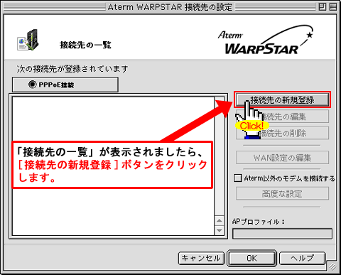 上記のエラーが表示された場合は、チェックのついた接続先が無い(通常利用する接続先が設定されていない)状態になっています。接続先をひとつ選択してチェックをつけてください。 |
