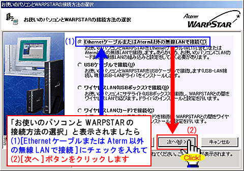 あらかじめパソコンとAtermをEthernetケーブルで接続しておいてください。