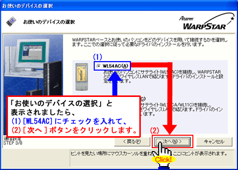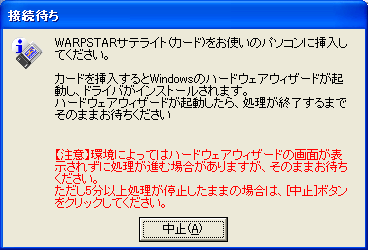 この画面が表示されましたら、パソコンにWL54ACを装着してください。 |