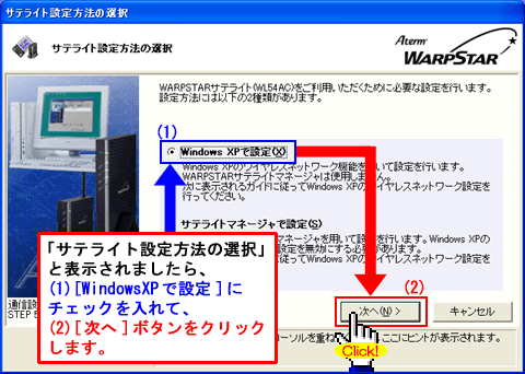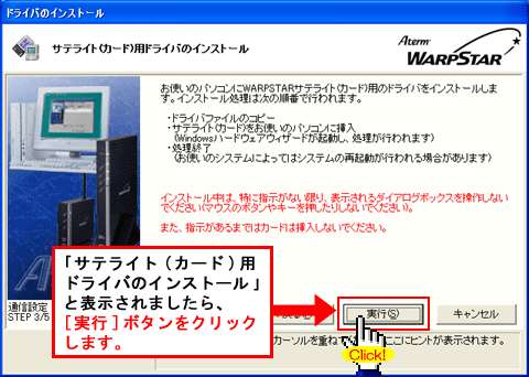「WARPSTARサテライト(USBボックス/カード)の設定を行います」と表示されましたら、画面内の【ご注意】をご確認の上、この画面を開いたまま次の10項の手順にお進みください。 |
