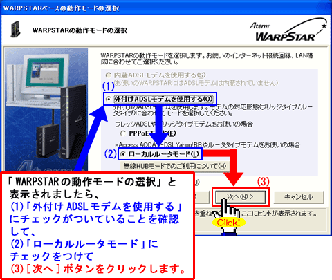 Windows(R) XP Service Pack 2(SP2)をご利用の場合、Step1に「」マークが表示され、以降の手順が行えないことがあります。このような場合は、クイック設定Webで以降の設定を行ってください。>こちらへ
